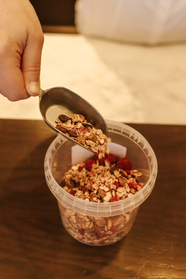 Heerlijke granola met stukjes pistache, chocolade en framboos